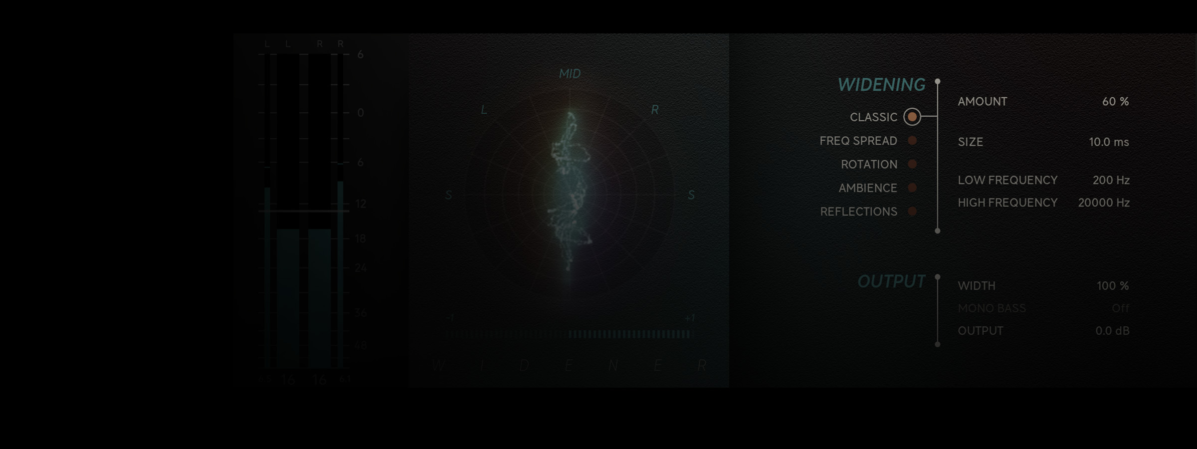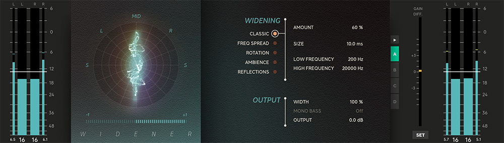 Each mix is distinctive and comes with diverse challenges and necessities. Using stereo width to enhance your mix might produce artifacts you'll want to consider. That's why we included no less than five different algorithms: Classic, Frequency Spread, Rotation, Ambience, and Reflections. Each algorithm has a unique strength, which allows you to find the sweet spot for your stereo image and minimize those unwanted artifacts.
