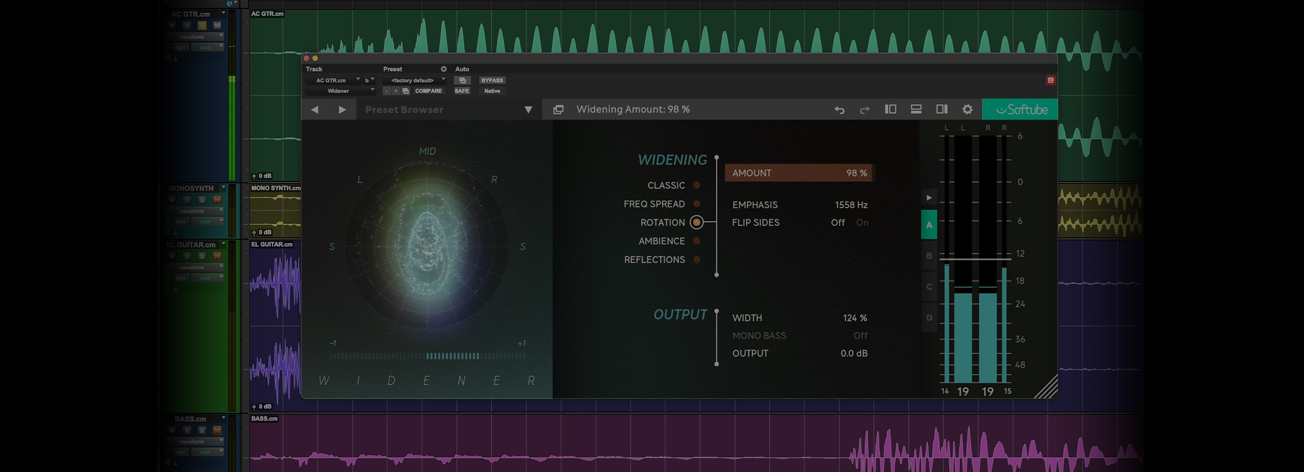 In short, the different algorithms use phase shifting, Mid/Side processing, or reverberation techniques to accomplish their sound. The goniometer and correlation meter provide real-time information about the stereo width and allow you to avoid pitfalls by confirming what you hear. Which empowers you to make the right choices for your mix.